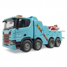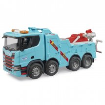 Brațul de ridicare este telescopic, reglabil pe înălțime și dotat cu troliu funcțional acționat manual, ideal pentru recuperarea vehiculelor accidentate. Cu ajutorul adaptorului inclus, camionul poate tracta orice model compatibil Bruder (MAN, Mercedes-Benz, MACK, Scania). Brătarul din spate se rabatează și permite susținerea roților față ale vehiculului tractat.
