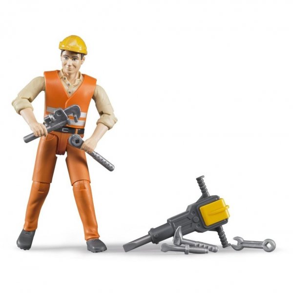 Linia de produse Bruder ofera o multime de produse - de la camioane la utilaje de constructii, excavatoare, macarale si multe altele - care imita chiar si cele mai minuscule detalii ale originalelor. Muncitorul in constructii cu accesorii este completarea ideala pentru orice vehicul de constructii care face parte din gama de produse cu acelasi nume. Doar pentru a fi in siguranta, am inclus o palarie dura si o vesta reflectorizanta pentru a permite muncitorului sa inceapa sa lucreze imediat. Setul include, de asemenea, un ciocan, precum si cinci instrumente suplimentare, care permit copiilor sa se teleporteze intr-o multitudine de scenarii de joaca. Vesta reflectorizanta si casca pot fi detasate.