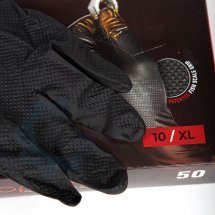 Modelul de solzi de pește Grippaz® nu numai că oferă o aderență superioară, dar servește ca o rețea de întărire care îmbunătățește considerabil rezistența la tracțiune a mănușii și creează un efect anti-rupere, făcându-l pe Grippaz® printre cele mai robuste mănuși de nitril de pe piață.